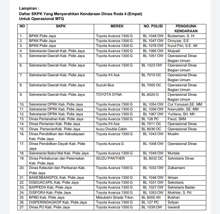 Isinya: seluruh SKPK yang namanya tertera diwajibkan menyerahkan mobil dinas roda empat untuk operasional MTQ Aceh ke-37 di Pidie Jaya.