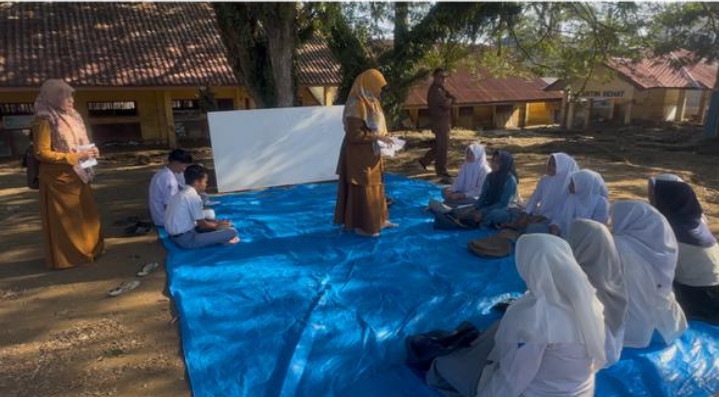 Nuraisyi, siswi SMAN 2 Meureudu, menceritakan kondisi yang mereka jalani saat ini. Tak ada lagi ruang kelas. Tak ada lagi bangku dan papan tulis. Proses belajar terpaksa dilakukan di luar ruangan, di bawah pepohonan, beralaskan terpal yang dibentangkan di atas lumpur.